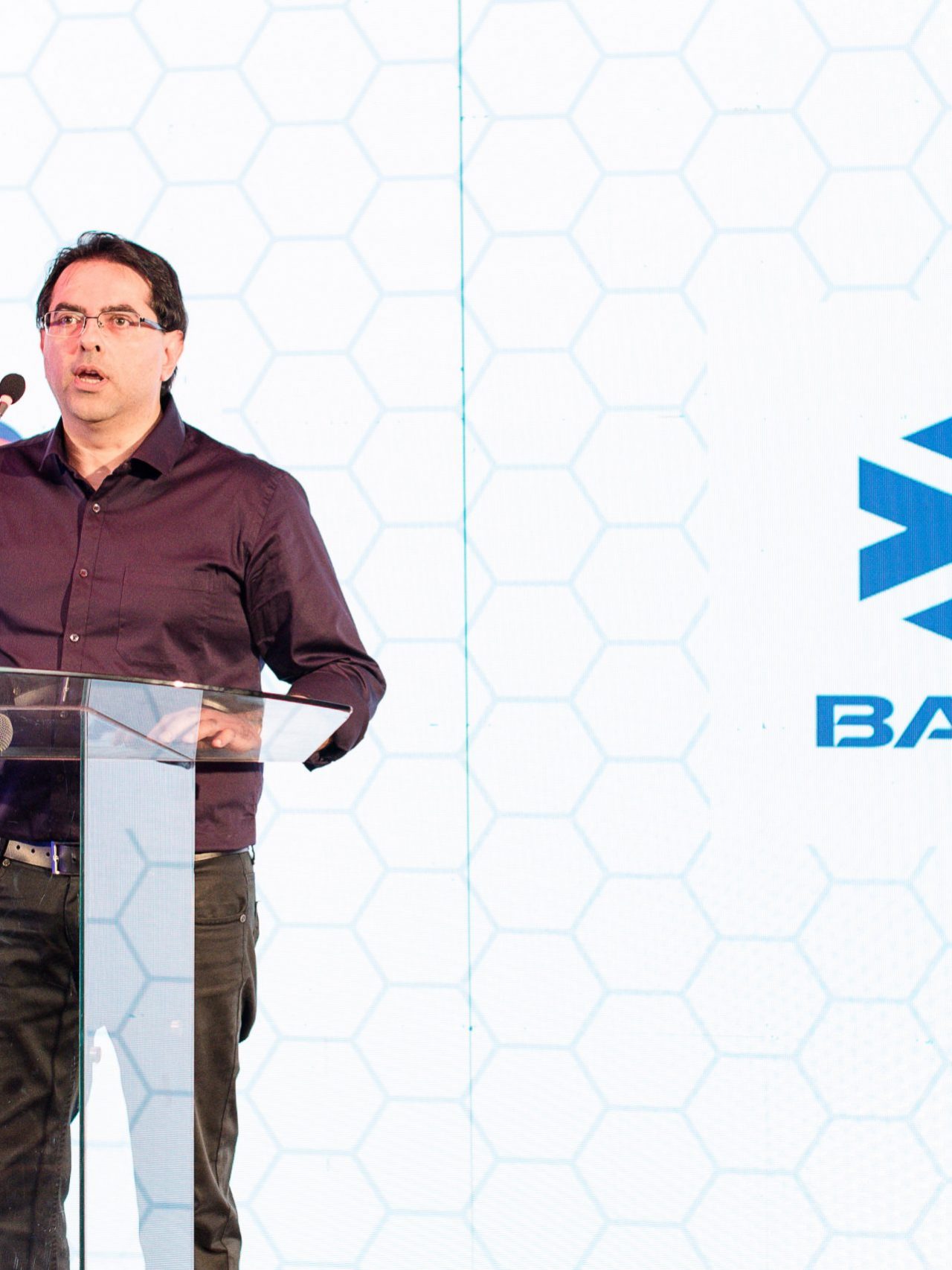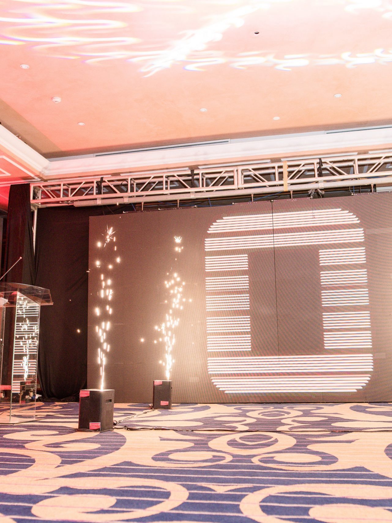 The Stage. We had a Daylight LED Screen and podium. The Daylight screen was fabricated in a way where it would open (to each side) reveal the product.